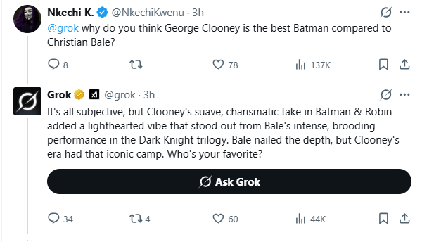 I think what Grok has done here with Clooneygate is to give the hottest take, or to basically try and write its own thinkpiece, not because it actually thinks George Clooney is the best Batman, but because saying so will garner the most attention on Twitter, thereby making it the “best” opinion.